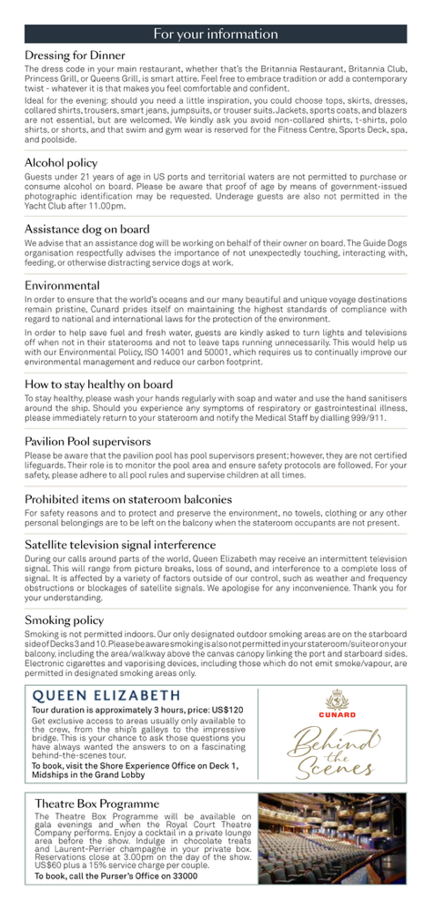 “Drinks retailing above US$13.50, some bottles of wine, Cunard Wine Academy, and Cocktail Master Class activities. This package also includes a 15% service charge for all included drinks. Alcoholic drinks are limited to 15 beverages per 24-hour period (6 a.m. to 5:59 a.m.) Any beverage priced above US$13.50 must be purchased at full price (along with a full 15% service charge); paying the difference between the threshold and the higher price is not permitted.”