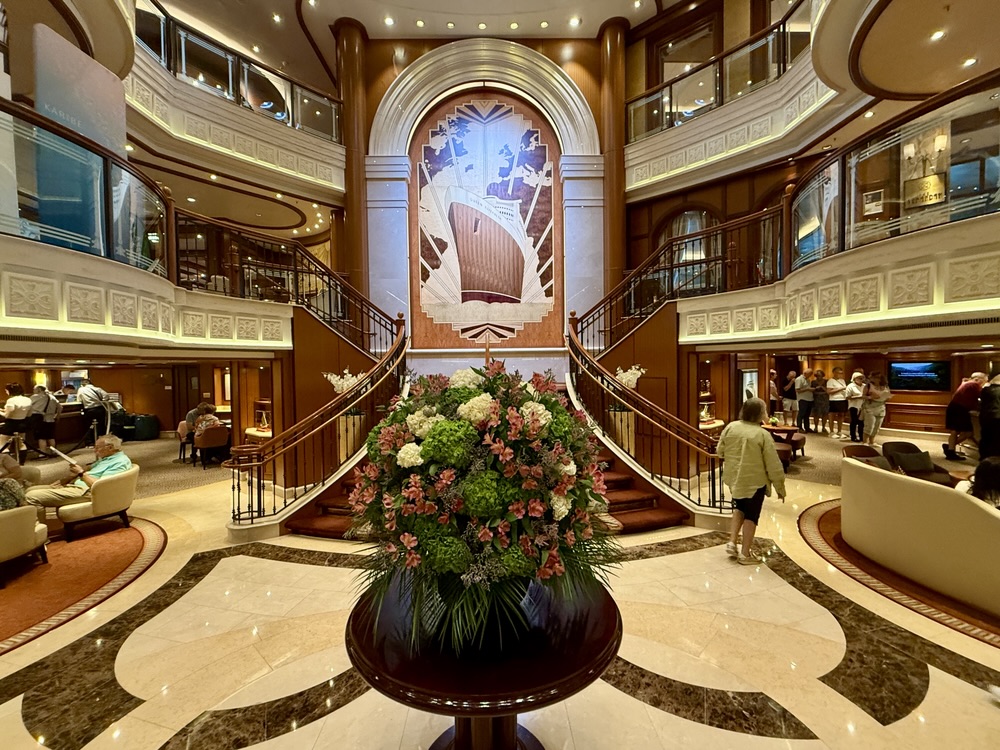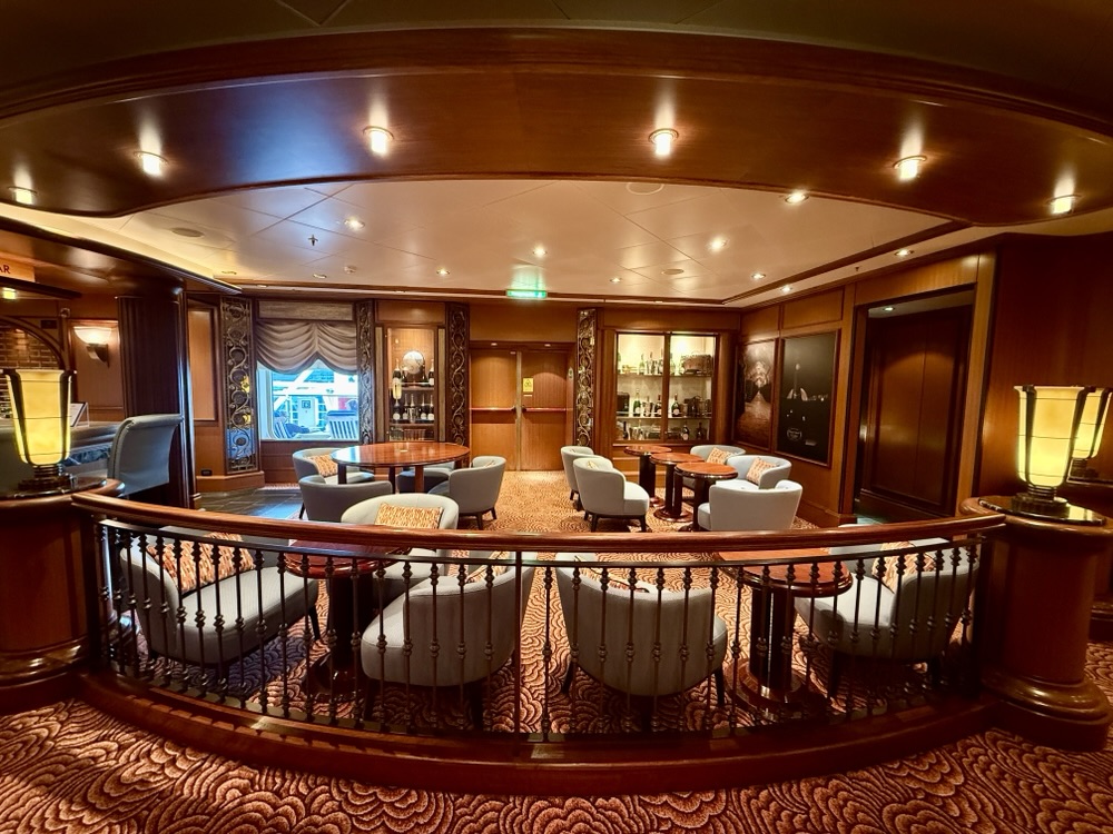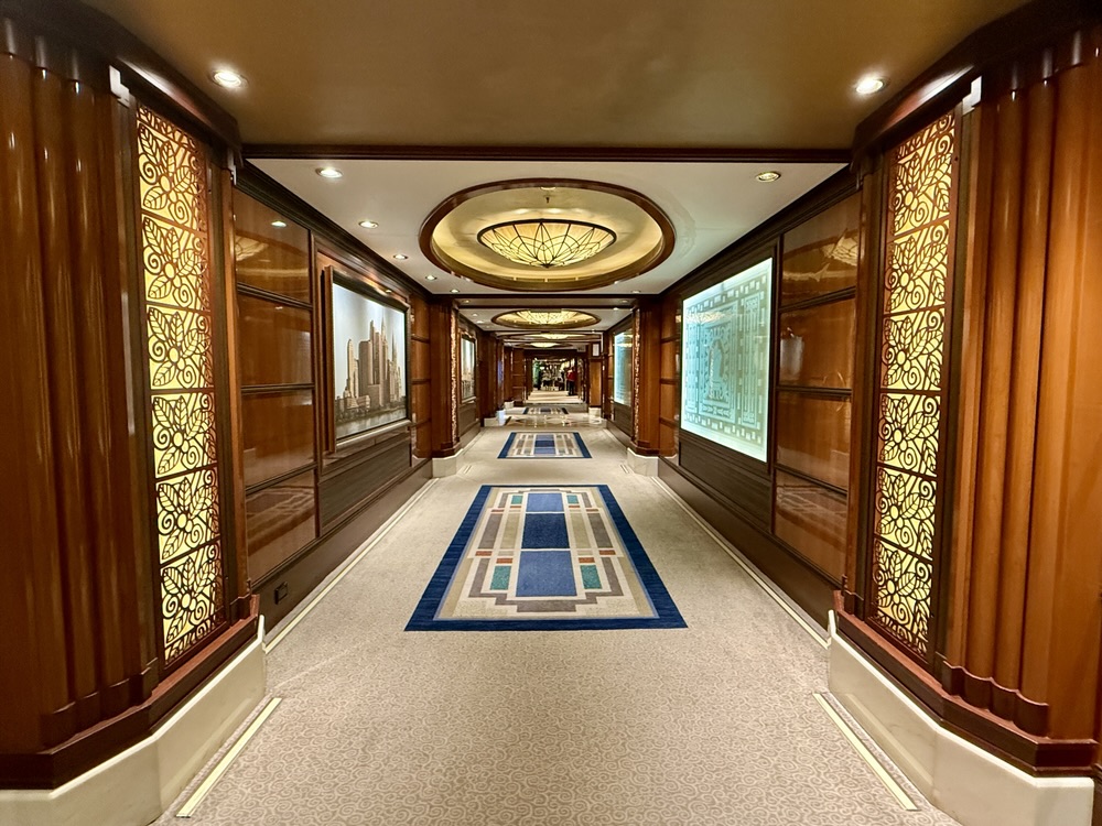 With the formalities out of the way, I decided to wander a bit before heading to my stateroom. This was the perfect time to snap some photos while the public spaces were still quiet. My first impression? This ship is stunning. Elegant wood tones, rich carpeting, and that timeless art deco design that Cunard is known for – it’s like stepping back in time. You can tell Queen Elizabeth was built with a sense of class that’s hard to find these days. No flashy LED walls or bumper cars here just elegance.