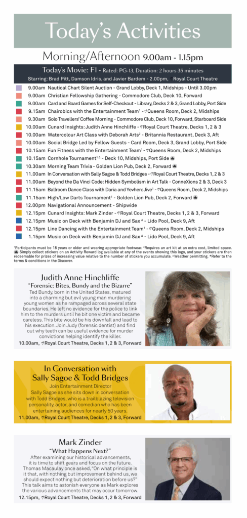 The daily lineup leans heavily on lectures and enrichment talks rather than constant “rah-rah” activities. Think PBS at sea.