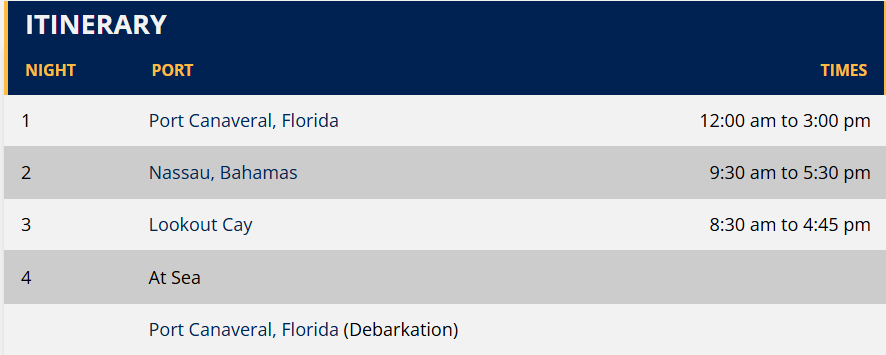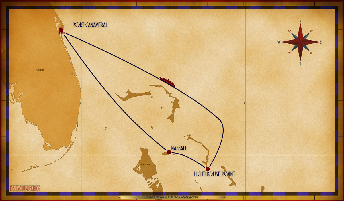 Our itinerary includes stops in Nassau and at Disney’s Lookout Cay, with a sea day in between.