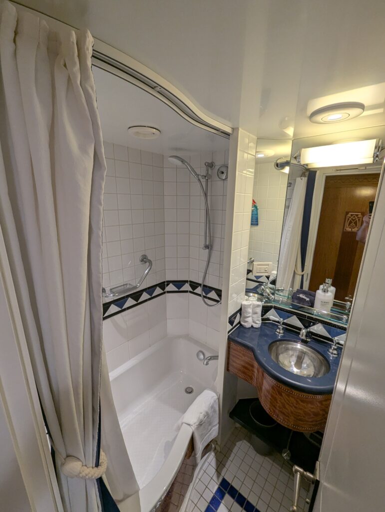 The split bathroom setup was slightly smaller than what we’re used to and featured the dreaded clingy shower curtain. One notable quirk — the doors to both bathrooms opened inward, meaning you had to do a bit of a shuffle to get in and out. Thankfully, newer Disney ships corrected this long ago, with outward-opening doors that won’t require choreography.