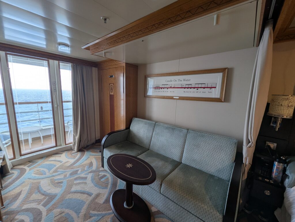 The room included a queen bed (no twins-pushed-together situation on Disney ships), a sleeper sofa, a pull-down bunk from the ceiling and a Murphy bed — allowing the room to comfortably sleep up to five passengers. Across from the sitting area you’ll find the typical desk and counter setup, complete with drawers, small cabinets and a concealed mini-fridge.