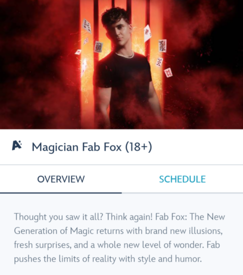 For this sailing, we have magician Fab Fox from Austria mystifying the audience with sleight of hand and illusions. I settled in to catch his adults-only show, hoping to be wowed. I wasn’t.