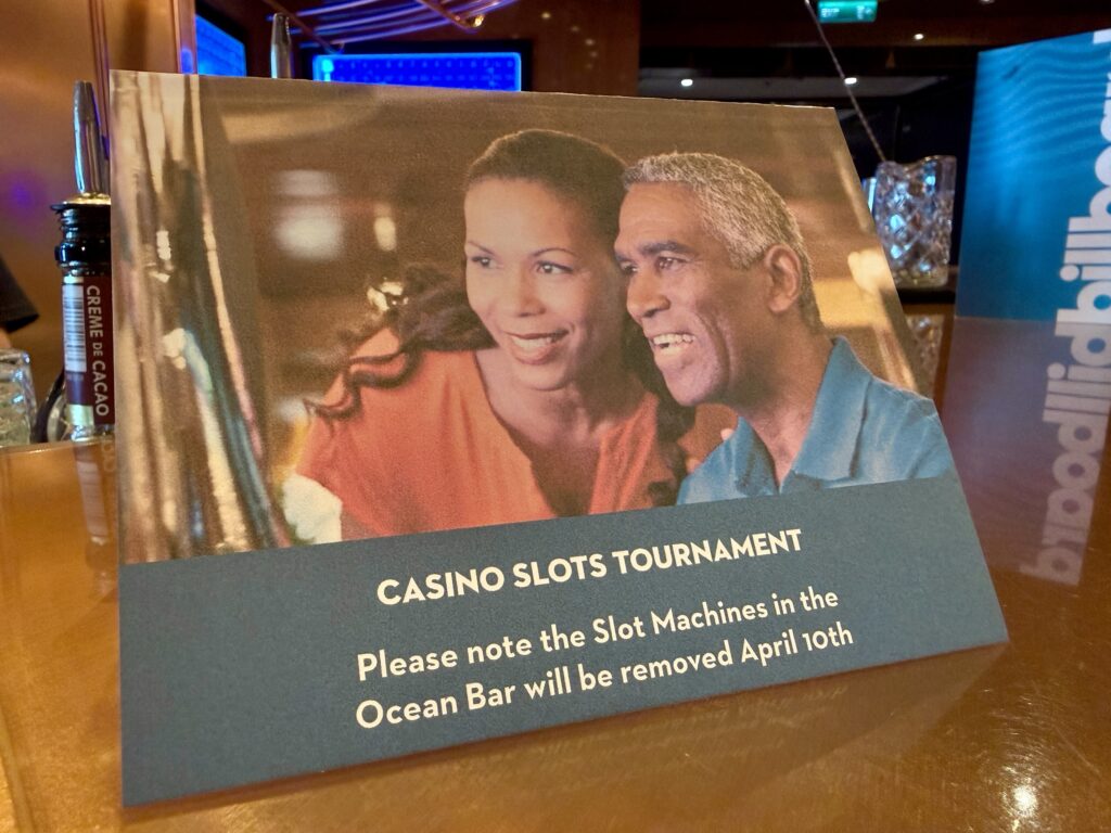 This sailing is also a casino tournament cruise, and with that is one of the more noticeable changes. Over at the always-popular Ocean Bar, where the usual seating has been removed and replaced with slot machines. This area is being used for the tournament, and when tournament play is not going on, the machines are available for regular guest use. For a lot of people, that’s actually a welcome change because it gives them a non-smoking place to play, which is a pretty big deal considering the main casino remains smoking.