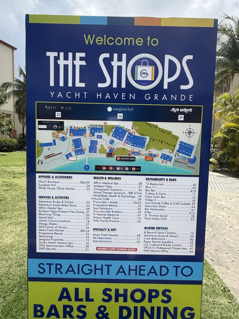 Havensight is the busier and more convenient of the two. It has the larger shopping area, easier access to Yacht Haven Grande shopping area (more on that in a minute), Paradise Point is right across the street, and it’s the dock most people would probably choose if the captain asked, “where should we dock today?. Crown Bay has a smaller shopping center and welcome area and is less convenient for most cruisers looking to wander, shop, or grab a taxi and go.