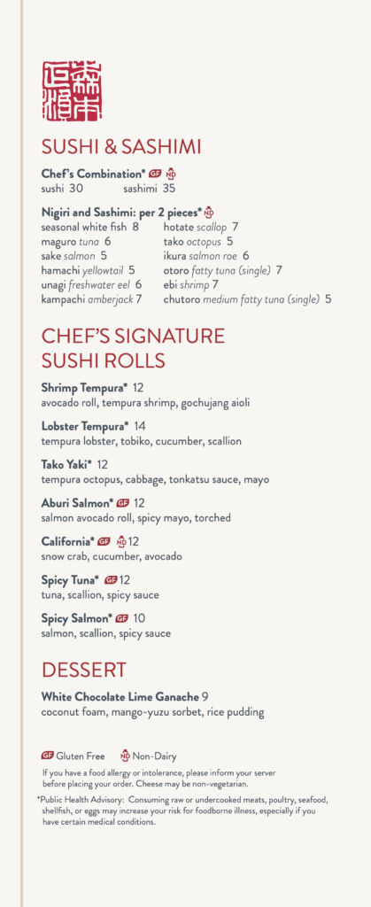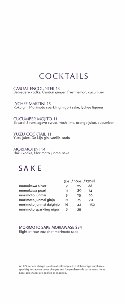 Now, Tamarind is one of the speciality restaurants on Rotterdam. The main dinner menu is $35 per person + 18%, and it’s worth every penny when you sit down for a full meal. But here’s where things get fun: Tamarind also has a dedicated Morimoto-branded sushi bar tucked off to one side with its own full sushi menu, and on the opposite side, there’s a proper bar that serves both sushi and a special lineup of Asian-inspired bar bites.
