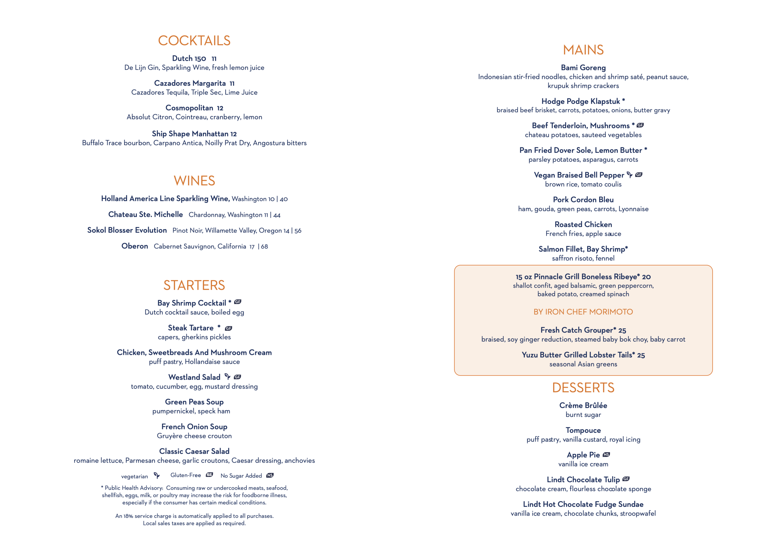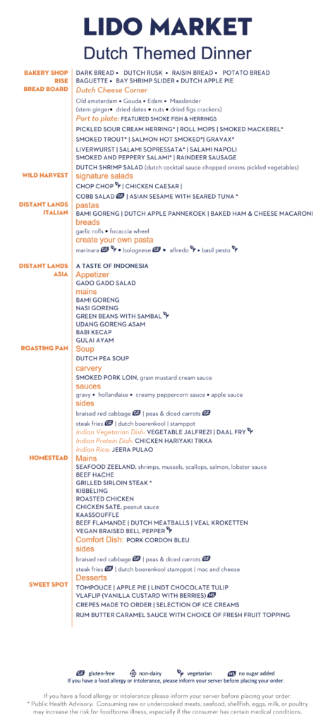 It isn’t just the attire that gets the Dutch treatment, the food does too. The Main Dining Room and Lido Market both roll out a special Dutch-themed dinner menu.