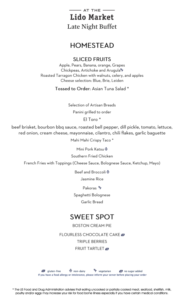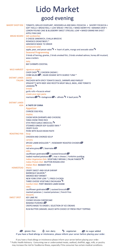 - New York Deli and Pizza – ★★★☆☆ – This spot is a hidden gem for quick eats. For breakfast, they serve scrambled eggs, hashbrowns, and bacon, where there’s never a line, and they usually stay open a half-hour longer than the Lido. When it comes to the pizza, the fresh-made round pies are great – thin, New York-style that you can customize. However, the square, ready-made slices were often inconsistent and sometimes left out longer than they should have been. I’ve noted that when they’re fresh out of the oven, the square slices are great – but after sitting around, forget it. With salads, desserts, and small bites late at night, this spot is a good place to hit when the munchies strike.