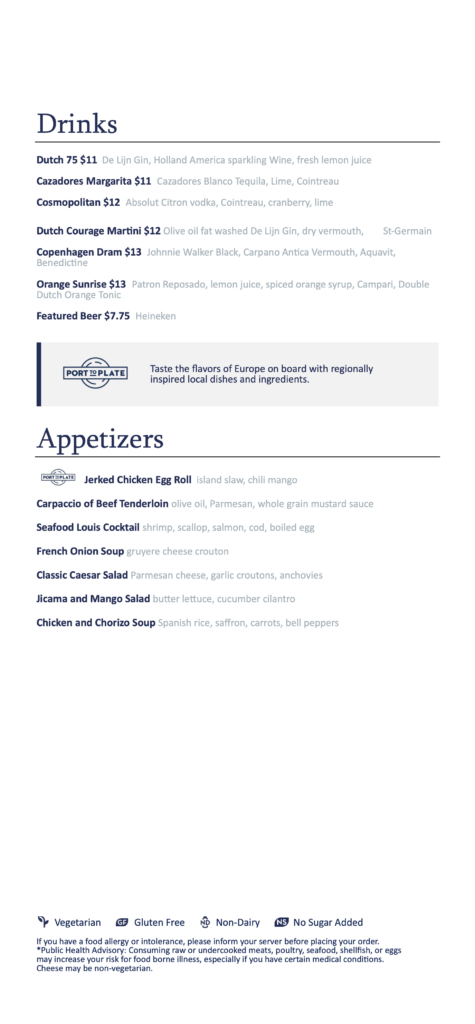 - Main Dining Room (MDR) – ★☆☆☆☆ – I sailed onto the Rotterdam with high expectations for the MDR, especially after the exceptional service and food I had just experienced on the Zuiderdam. Sadly, I was disappointed. Overall, the experience was sterile. The dining room staff were not overly friendly, service often felt rushed, and the food was consistently average, and sometimes even cold. After a particularly disastrous Thanksgiving dinner where my server clearly wanted to be anywhere but where he was, I decided that was the end of the MDR for me. For this entire nine-day segment, I didn’t set foot in the dining room again. This was a shocking and frustrating contrast to the fantastic experience I’d had just days before.