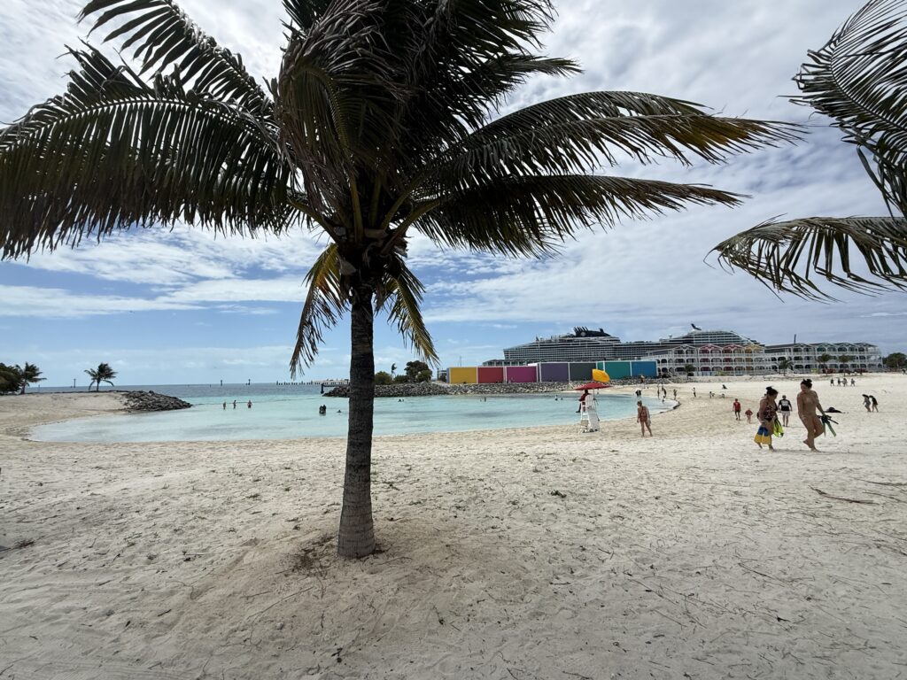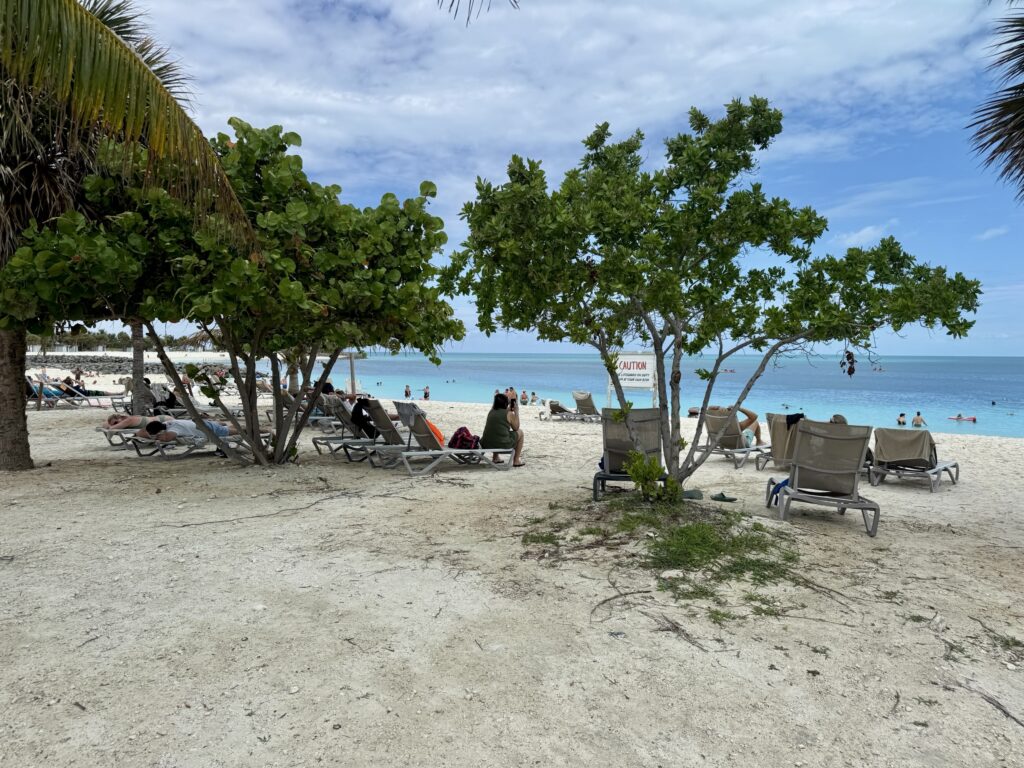 The first and most obvious one is Lighthouse Beach, because it’s basically right there when you get off the ship. It’s one of the most popular spots for that reason alone, and it gives you great views back toward the ship. It also has chairs, umbrellas, food nearby, and easy access to drinks, which means a lot of people stop there and never bother going any farther. One thing to keep in mind though is that the seating there includes those Adirondack-style chairs rather than traditional loungers, so if your idea of a beach day involves a lounger and umbrella, you won’t find that here.