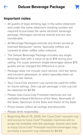 Starting March 15, 2026, Royal Caribbean is making a change that has sent the cruise community into an absolute meltdown: the Coca-Cola souvenir cup and access to Coca-Cola Freestyle machines will no longer be included with the Deluxe or Royal Refreshment Packages.  This will only apply to drink packages purchased after March 15, 2026.  Those who pre-purchase prior to March 15, 2026 will still receive the cup and Freestyle machine access.