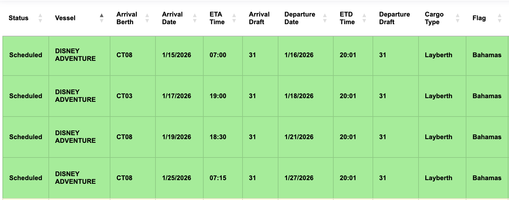 According to the port schedule, here is the ship’s itinerary for late January 2026: